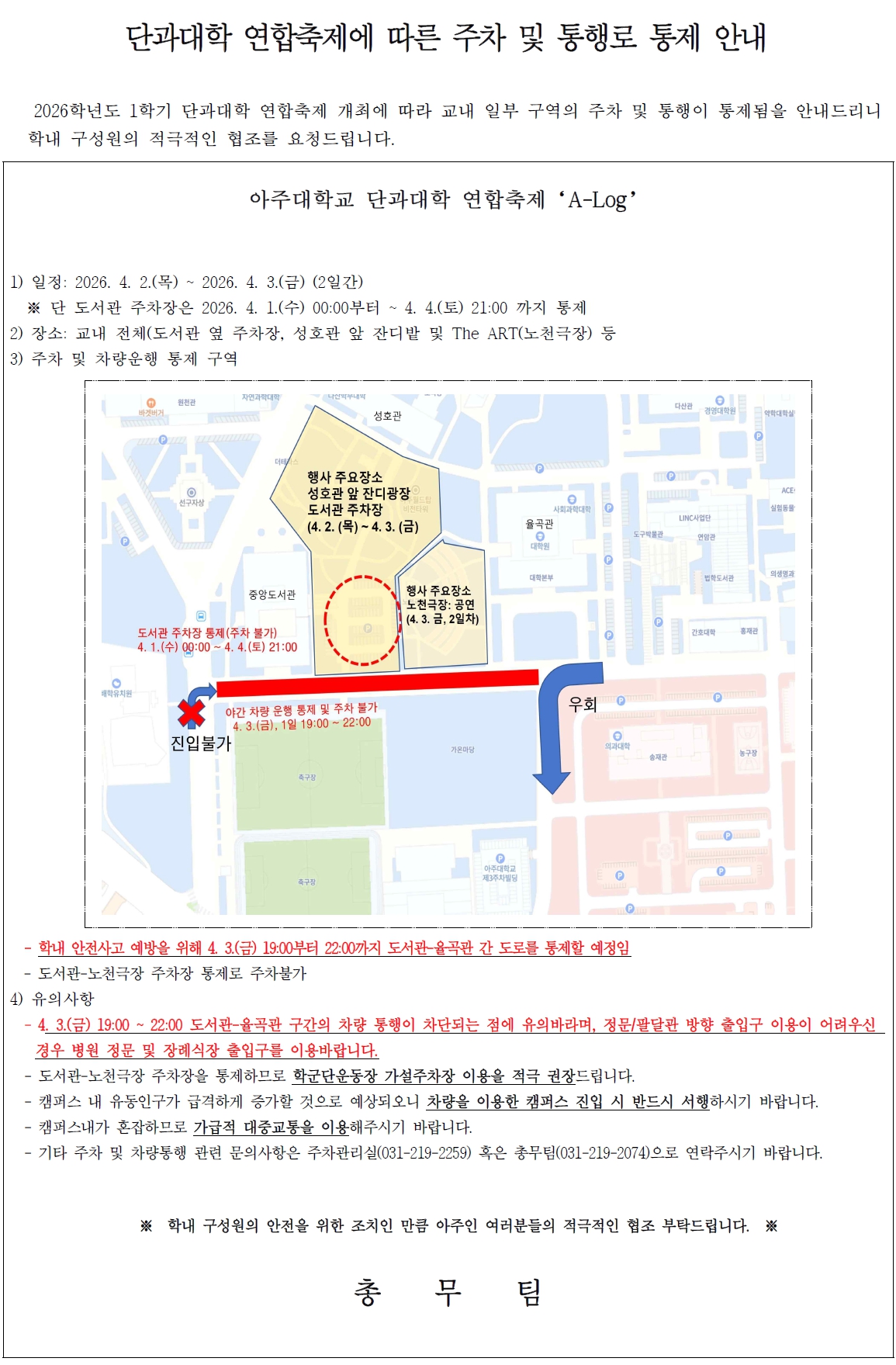 단과대학 연합축제에 따른 주차 및 통행로 통제 안내