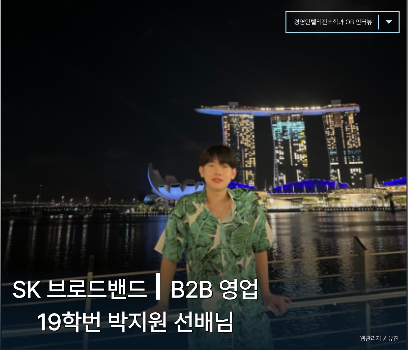 이번 주인공은 SK브로드밴드 B2B 영업 직무에서 활약 중인 19학번 박지원 선배님입니다!