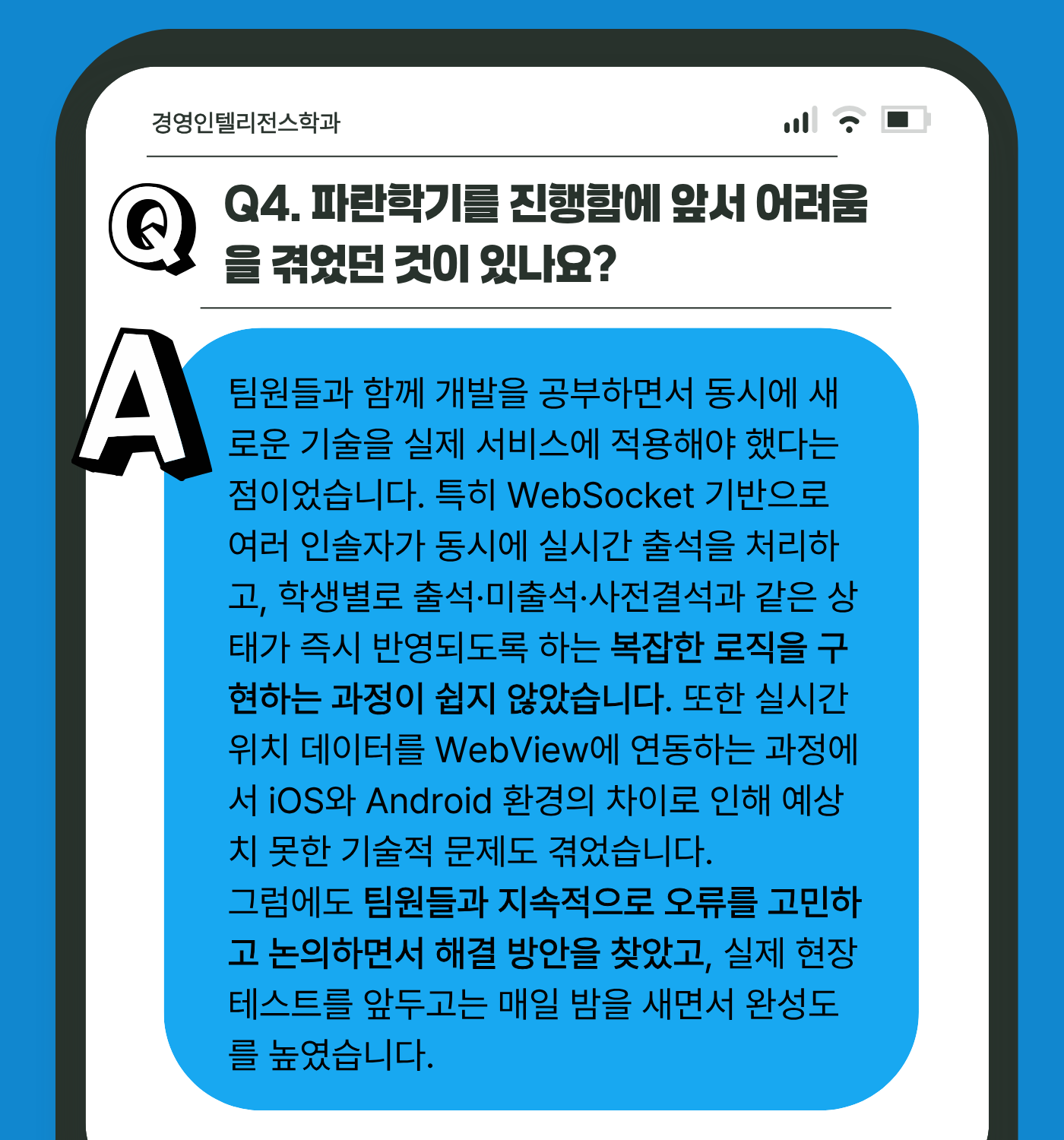 워킹스쿨버스 운영을 디지털로 관리·지원하기 위한 공공서비스 앱 개발 프로젝트로 파란학기에 참가하여 수상한 팀이죠.