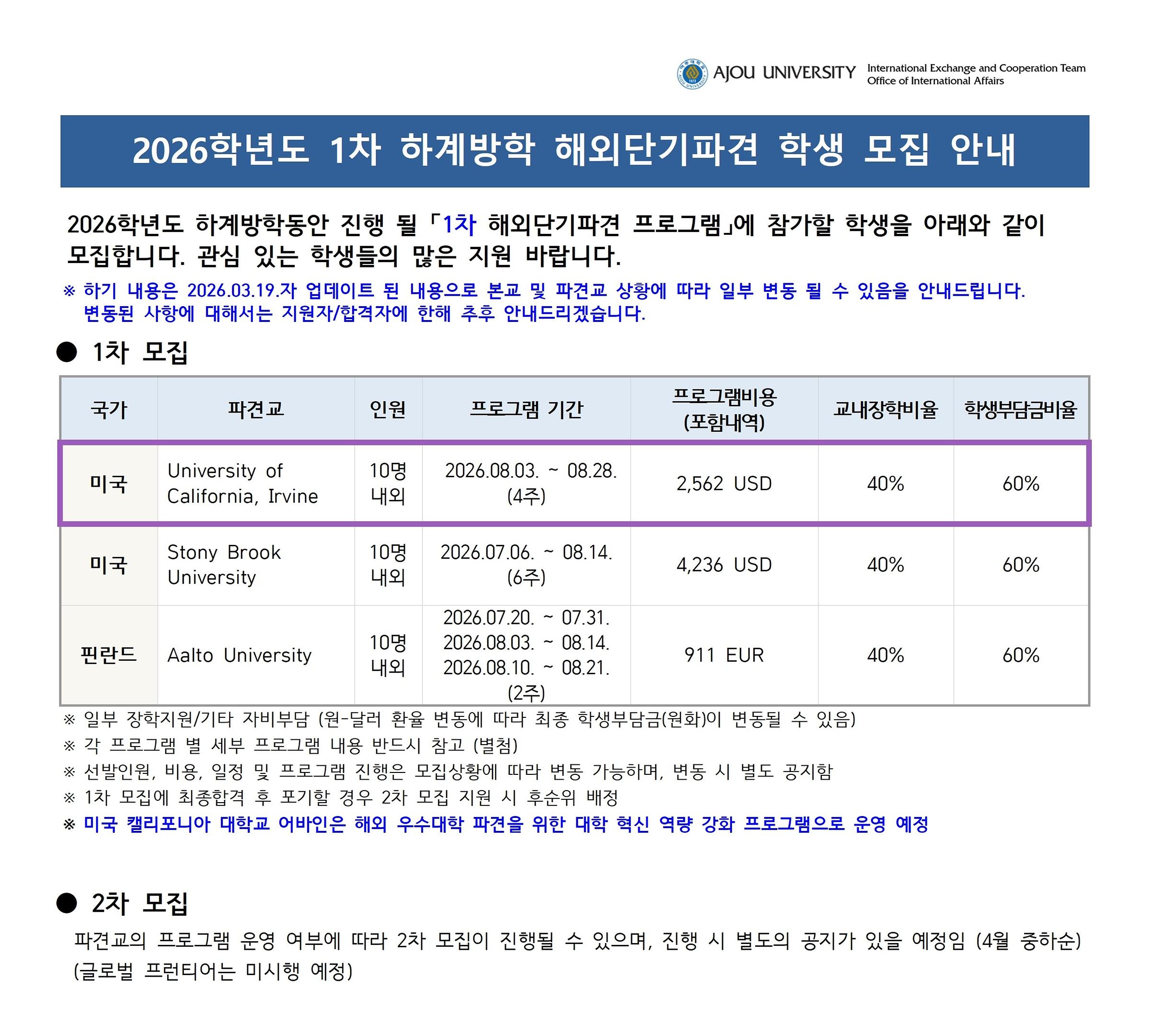 [공지] [국제교류팀] [하계 1차] 2026 해외단기파견 프로그램 참가자 모집 (3/20~3/25)