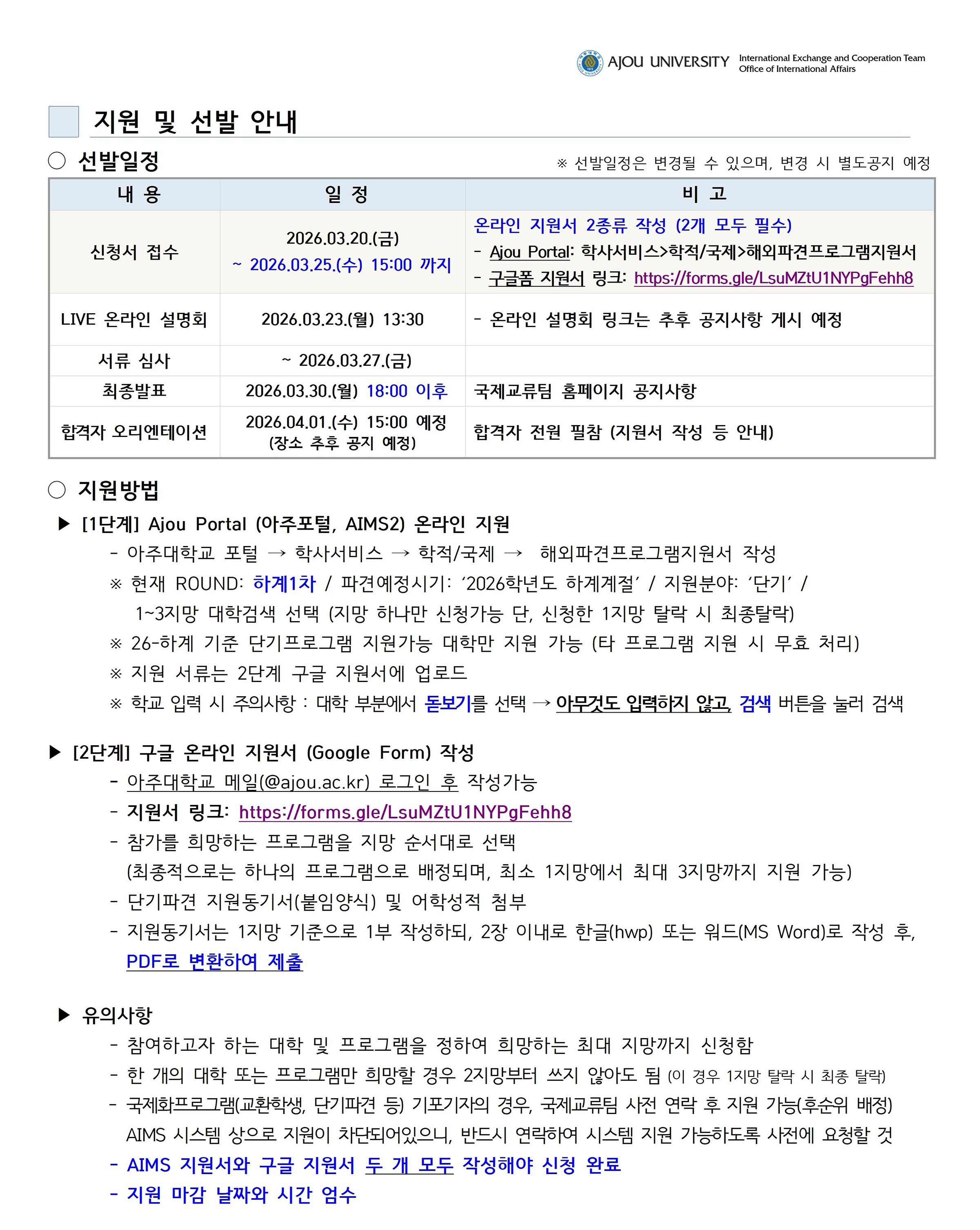 ▷ 2026.3.20.(금) ~ 2026.3.25.(수) 15:00까지 | 지원서 작성 (★★★아주포털 및 구글폼(지원동기) 꼭 2개 모두 작성!★★★)